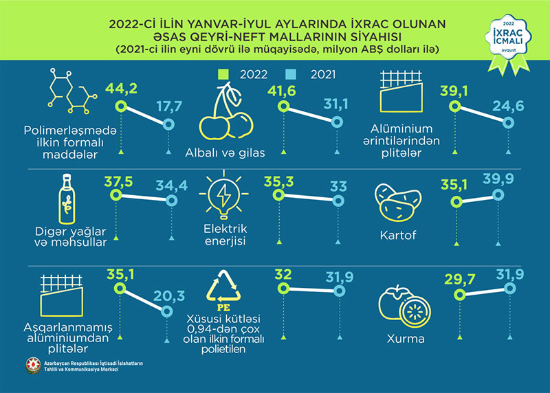 İqtisadi İslahatların Təhlili və Kommunikasiya Mərkəzinin təqdim etdiyi “İxrac icmalı”nın avqust sayına əsasən, 2022-ci ilin yanvar-iyul aylarında Azərbaycanın ümumi ixracı 22,6 milyard ABŞ dolları, qeyri-neft sektoru üzrə ixrac 1,7 milyard ABŞ dolları təşkil edib. Qeyri-neft sektoru üzrə ixrac 2021-ci ilin ilk yeddi ayı ilə müqayisədə 24,2% artıb.