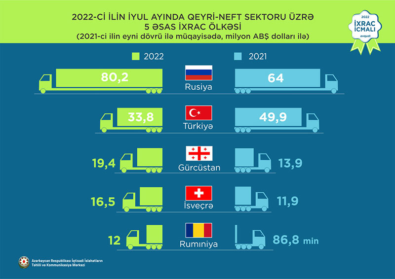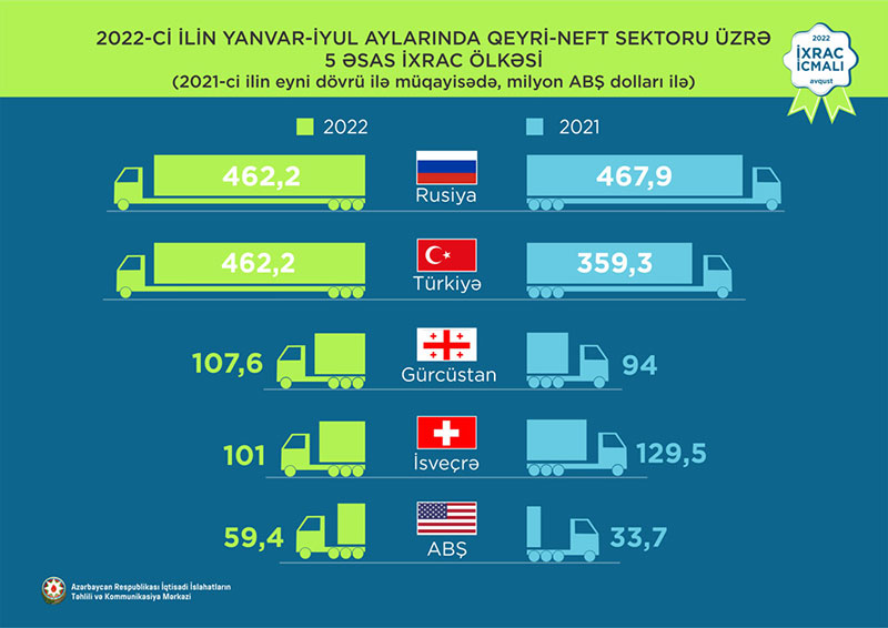 2022-ci ilin yanvar-iyul ayları ərzində Rusiya Federasiyasına 462,2 milyon ABŞ dolları, Türkiyəyə 462,2 milyon ABŞ dolları, Gürcüstana 107,6 milyon ABŞ dolları, İsveçrə Konfederasiyasına 101 milyon ABŞ dolları və ABŞ-a isə 59,4 milyon ABŞ dolları dəyərində qeyri-neft sektoruna aid mal ixrac olunub.