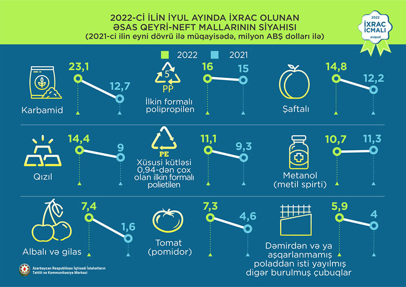 2022-ci ilin iyul ayında ixrac edilən qeyri-neft sektoruna aid malların siyahısında karbamid (23,1 milyon ABŞ dolları) birinci, ilkin formalı polipropilen (16 milyon ABŞ dolları) ikinci və şaftalı meyvəsi (14,8 milyon ABŞ dolları) üçüncü olub.