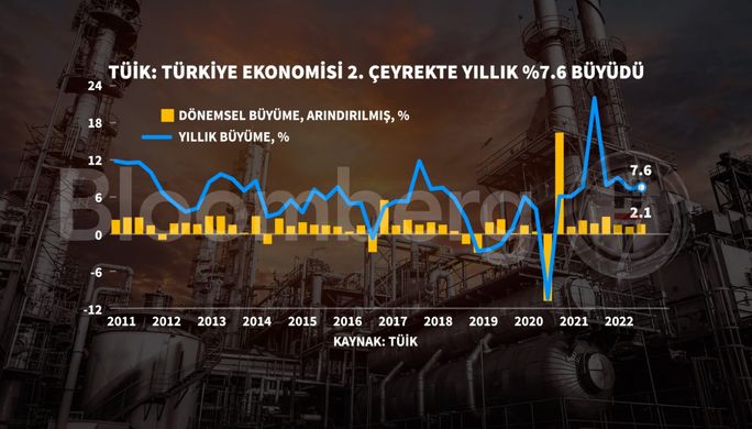 Marja xəbər verir ki, 2022-ci ilin ikinci rübündə Türkiyə iqtisadiyyatı illik müqayisədə 7,6 faiz artıb. Bloomberg-in sorğusuna qatılan iqtisadçıların orta proqnozu 7,4 faiz idi.