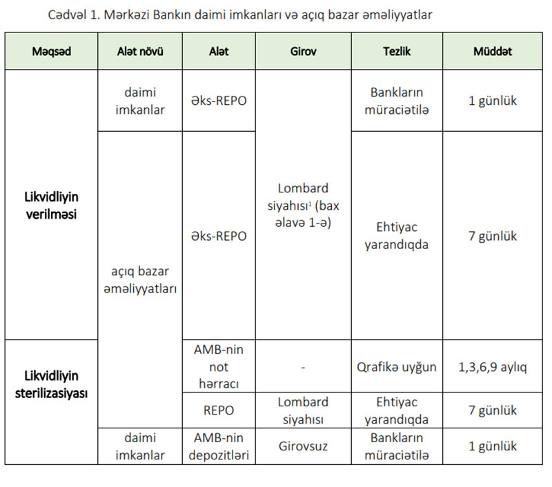 Həmçinin, Mərkəzi Bank tərəfindən açıq bazar əməliyyatlarının təkmilləşdirilməsi çərçivəsində sterilizasiya məqsədilə zəruri halda 1,3,6 və 9 aylıq notlarla yanaşı 7 günlük repo hərraclarının keçirilməsi nəzərdə tutulur. Likvidliyin verilməsi yönümlü açıq bazar əməliyyatları olaraq zəruri hallarda 7 günlük əks-repo hərraclarının keçirilməsi planlaşdırılır. 7 günlük repo əməliyyatları üzrə faizlərin faiz dəhlizinin aşağı həddi ilə uçot dərəcəsi arasındakı intervalda (4%-7,75%) tənzimlənməsi nəzərdə tutulur. 7 günlük əks-repo əməliyyatlarına görə faizlər uçot dərəcəsi ilə faiz dəhlizinin yuxarı həddi arasındakı intervalda (7,75%-9,25%) müəyyənləşəcəkdir. 1,3,6 və 9 aylıq notların gəlirliyi isə bazarda tələb-təklif nisbətindən asılı olaraq formalaşacaqdır. Pul bazarı, xüsusilə də banklararası bazardakı vəziyyətdən asılı olaraq digər açıq bazar əməliyyatları da tətbiq oluna bilər.