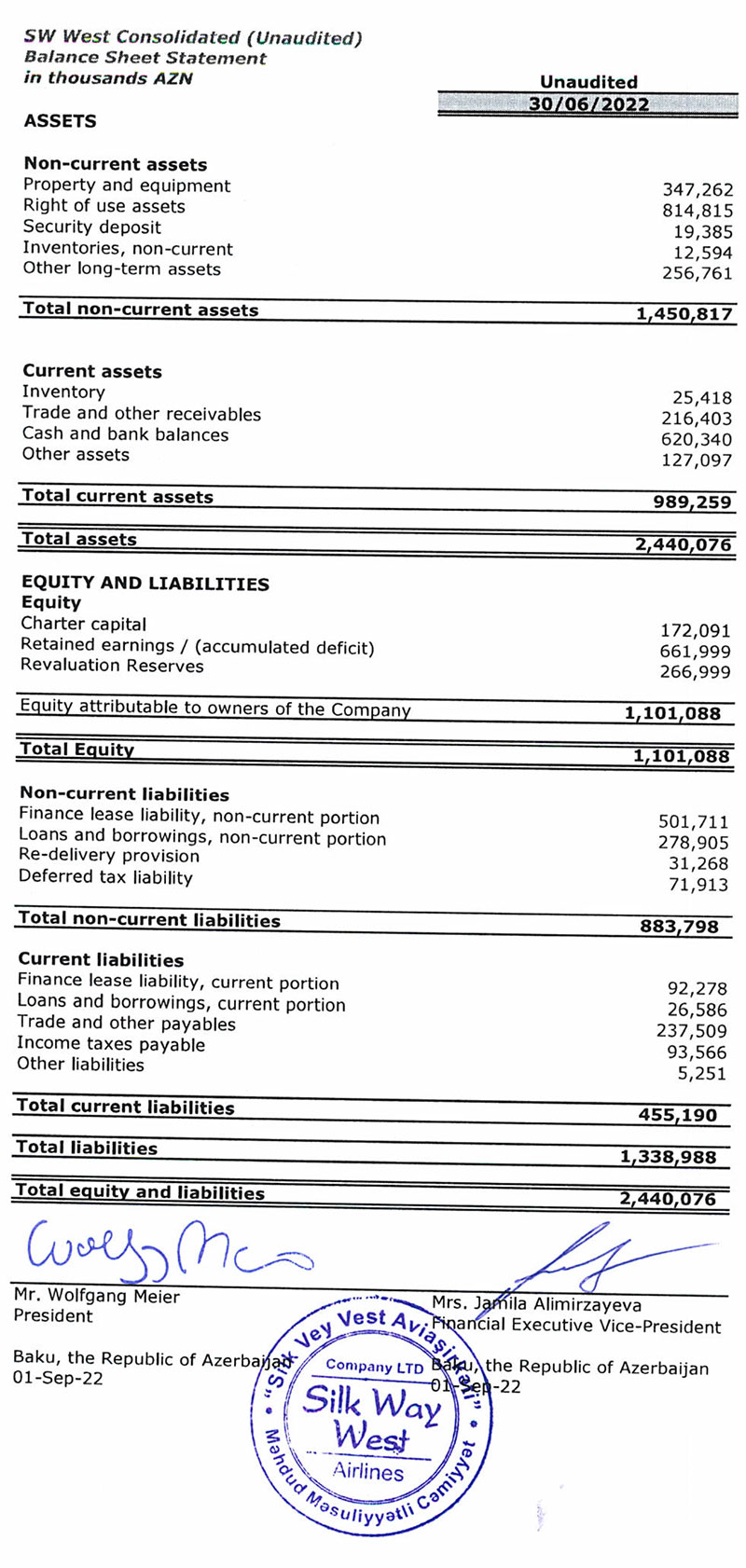 Kommersiya hava daşımaları ilə məşğul olan "Silk Vey Vest Aviaşirkəti" MMC 2022-ci ilin 1-ci yarısını 602 milyon 314 min manat xalis mənfəət ilə başa vurub. Bu, hər gün orta hesabla 3,3 milyon manatdan çox xalis qazanc deməkdir.