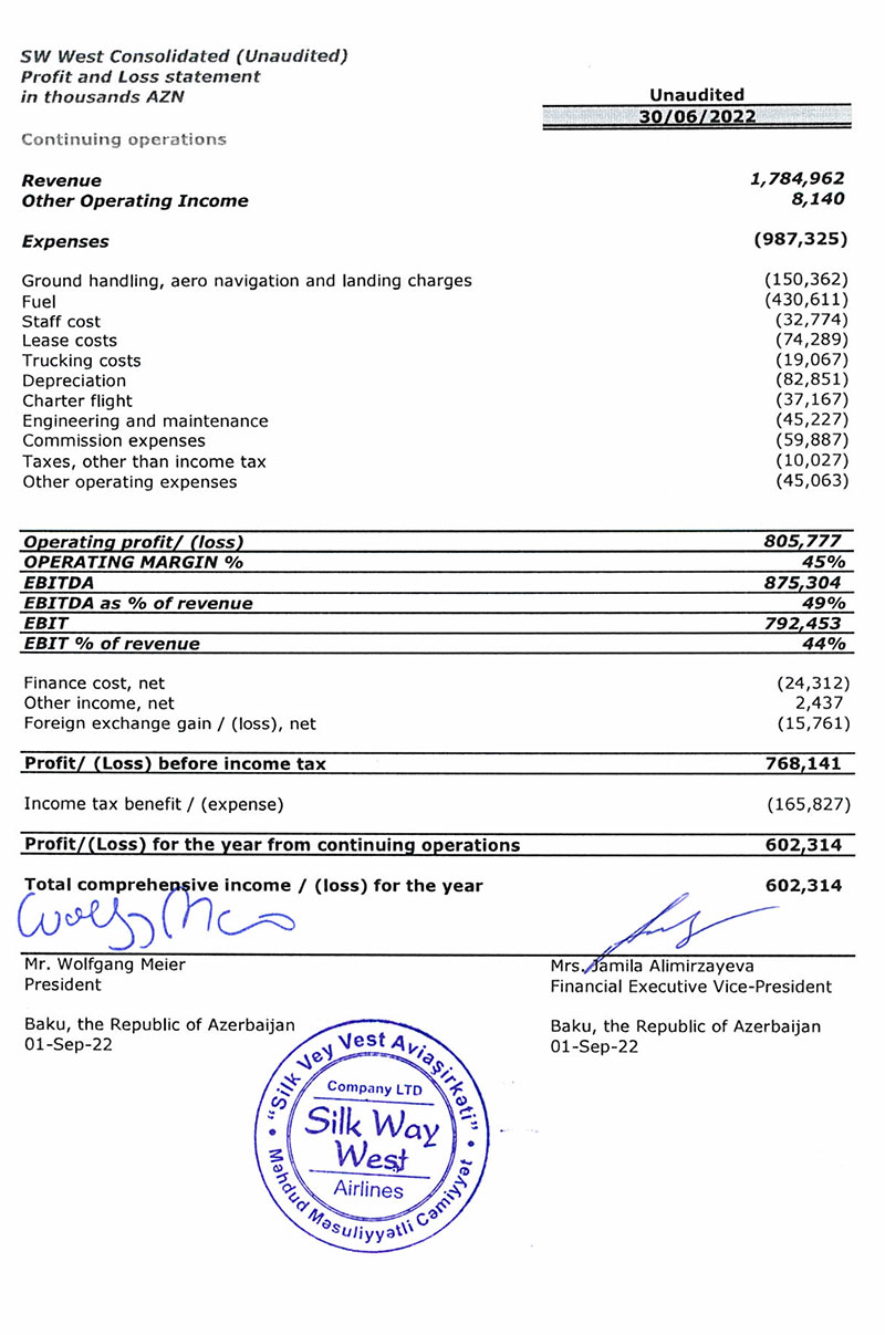 Qeyd edək ki, 2021-ci ildə "Silk Vey Vest Aviaşirkəti" MMC-nin cəmi əməliyyat gəlirləri 2 milyard 906 milyon 667 min manat, xalis mənfəəti isə 920 milyon 230 min manat təşkil etmişdi. Şirkət 2020-ci ildə isə 2 milyard 388 milyon 576 min manat cəmi əməliyyat gəlirləri, 630 milyon 392 min manat xalis mənfəəti əldə etmişdi.