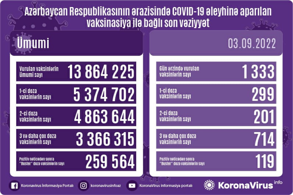 Azərbaycanda son sutkada koronavirus (COVID-19) əleyhinə 1 333 vaksin vurulub. Bir gündə birinci mərhələ üzrə vaksinasiya olunanların sayı 299, ikinci mərhələ üzrə vaksinasiya olunanların sayı 201, üç və daha çox doza üzrə vaksinasiya olunanların sayı 714, pozitiv nəticədən sonra buster doza üzrə vaksinasiya olunanların sayı 119 nəfərdir.