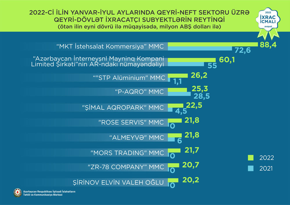 İqtisadi İslahatların Təhlili və Kommunikasiya Mərkəzi “İxrac icmalı”nın avqust sayında qeyri-neft sektoru üzrə 2022-ci ilin yanvar-iyul aylarında həyata keçirilən ixracla bağlı qeyri-dövlət ixracatçı subyektlərin reytinqi tərtib edilib.