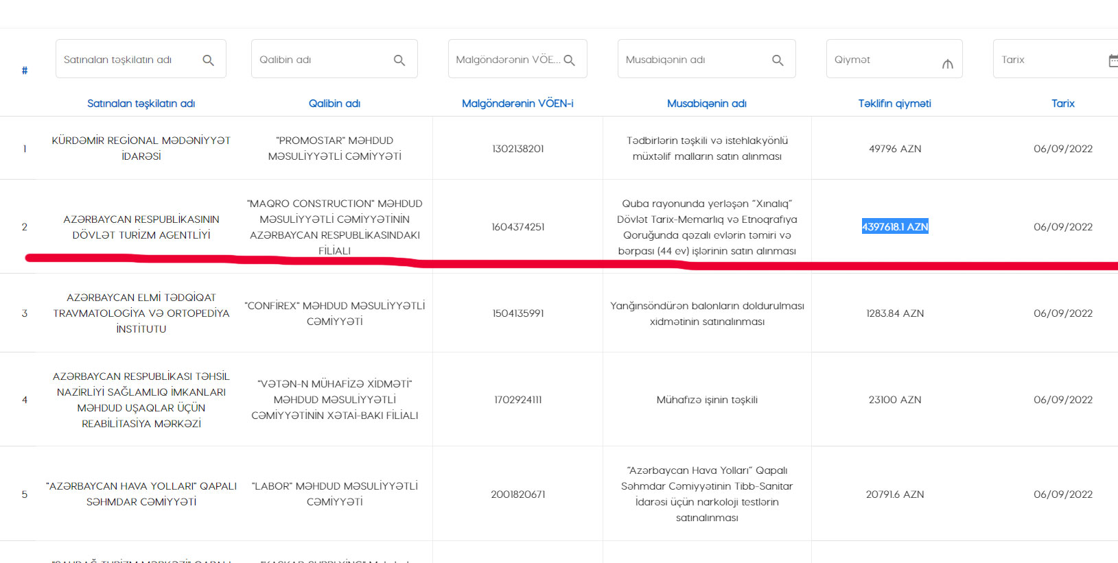 Dövlət Turizm Agentliyi "Quba rayonunda yerləşən “Xınalıq” Dövlət Tarix-Memarlıq və Etnoqrafiya Qoruğunda qəzalı evlərin təmiri və bərpası (44 ev) işlərinin satın alınması" ilə bağlı keçirdiyi tenderi yekunlaşdırıb.
