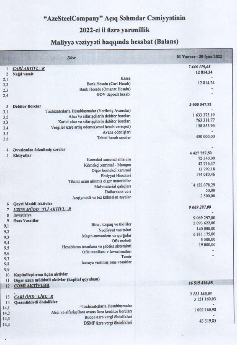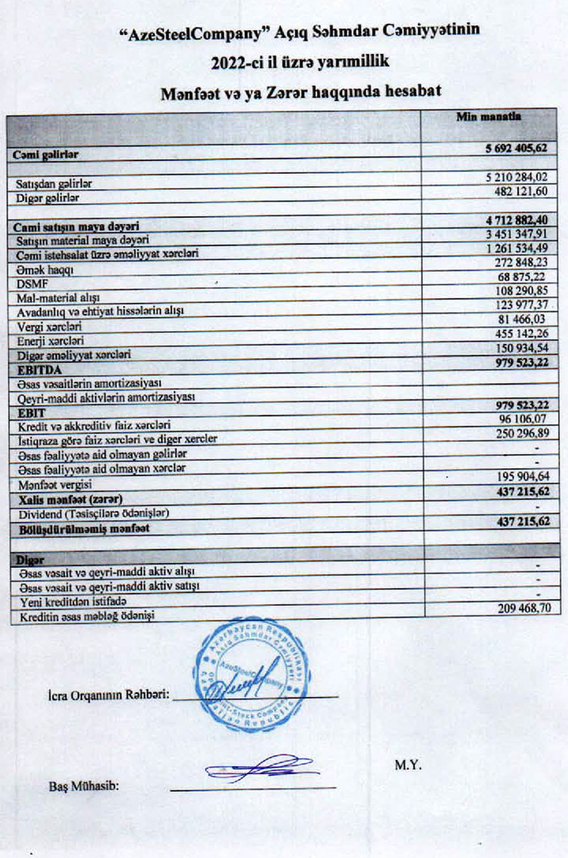 Armaturlar daxil metal məmulatların və sənaye qazlarının istehsalı ilə məşğul olan "AzeSteelCompany" ASC 2022-cii lin 1-ci yarısını (yanvar-iyun dövrünü) 437 min manat xalis mənfəət ilə başa vurub.