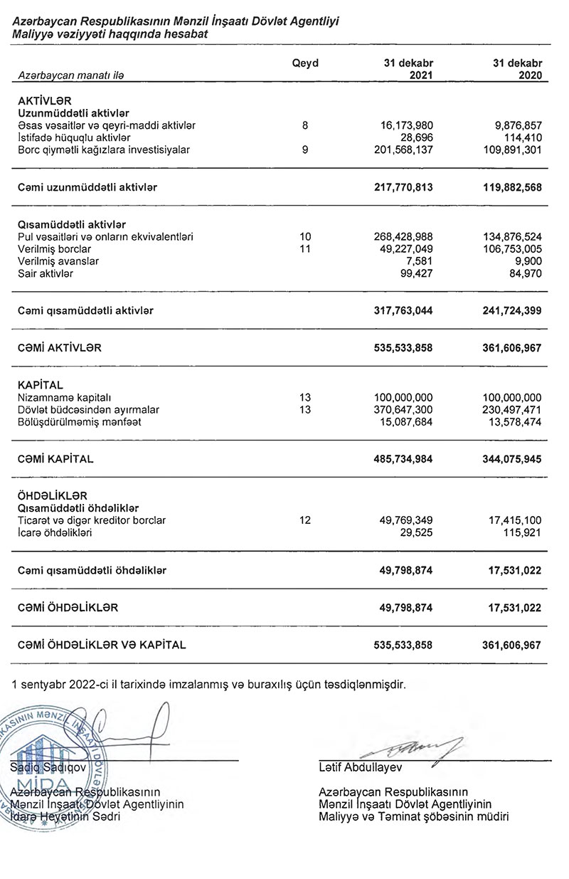 Azərbaycan Respublikasının Mənzil İnşaatı Dövlət Agentliyi (MİDA) 2021-ci ili 1 milyon 509 min manat xalis mənfəət ilə başa vurub.