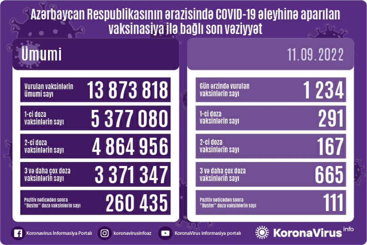 Azərbaycanda son sutkada koronavirus (COVID-19) əleyhinə 1234 vaksin vurulub. Bir gündə birinci mərhələ üzrə vaksinasiya olunanların sayı 291, ikinci mərhələ üzrə vaksinasiya olunanların sayı 167, üç və daha çox doza üzrə vaksinasiya olunanların sayı 665, pozitiv nəticədən sonra buster doza üzrə vaksinasiya olunanların sayı 111 nəfərdir.