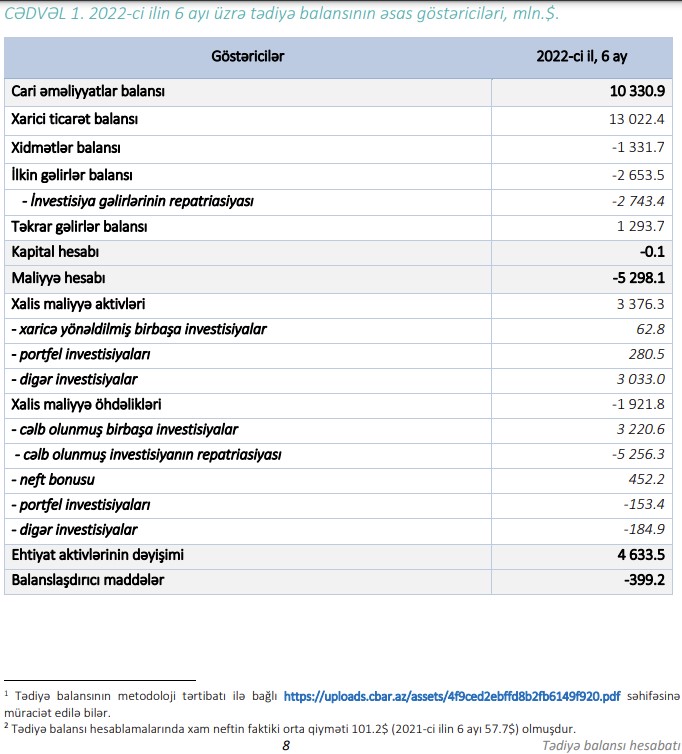 Cari əməliyyatlar balansında 10,3 milyard dollarlıq profisit (2021-ci ilin 6 ayı üzrə cari əməliyyatlar hesabının profisiti 1.9 milyard dollar olmudu), kapital və maliyyənin hərəkəti hesabında isə 5.3 milyard dollarlıq kəsir yaranmış, ehtiyat aktivləri 4.6 milyard artmışdır. Bu dövrdə xam neftin orta qiyməti 101dollar/barel2 olmuş, qeyri-neft ixracı isə 32.6% artaraq 1.4 milyard dollar səviyyəsində formalaşmışdır.