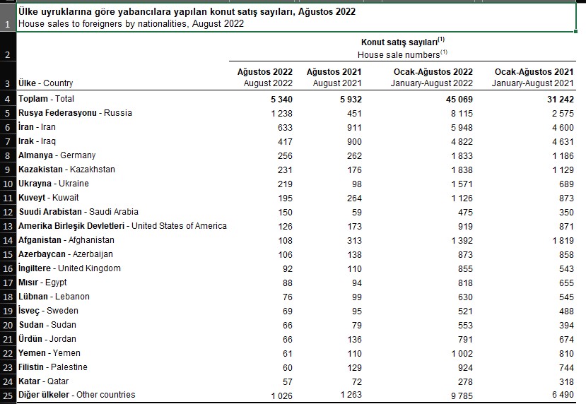 2022-ci ilin yanvar-avqust aylarında (8 ayda) azərbaycanlılar Türkiyədə 873 mənzil (ev) alıblar.