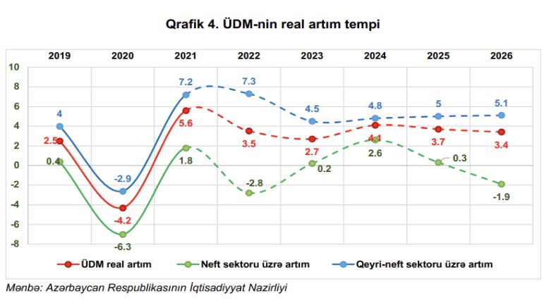 Azərbaycan Respublikasının İqtisadiyyat Nazirliyi tərəfindən hazırlanmış 2023-cü il və sonrakı üç il üzrə baza ssenaridə (neftin bir barrelinin orta illik ixrac qiyməti 2023-2026- cı illər üçün 50 ABŞ dolları fərz edilməklə) makroiqtisadi proqnoz göstəricilərinə əsasən cari ildə ölkədə ÜDM-nin real artımı 3,5 faiz olmaqla 117,3 milyard manat, o cümlədən qeyri-neft ÜDM-nin artımı 7,3 faiz olmaqla 67,1 milyard manat təşkil edəcəkdir.