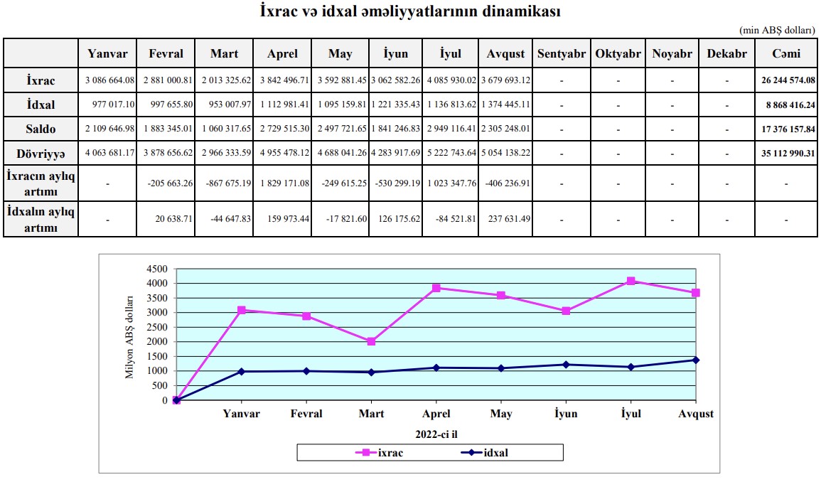 2022-ci ilin 8 ayı ərzində (yanvar-avqust) Azərbaycanın xarici ticarət əməliyyatlarının həcmi 35 milyard 112 milyon 990.32 min ABŞ dolları təşkil edib.