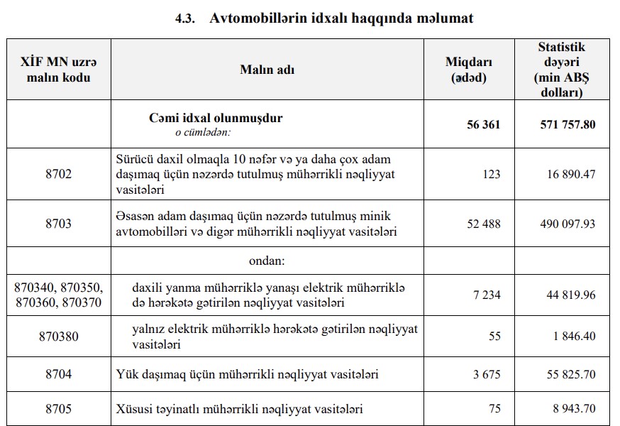2022-ci ilin 8 ayında Azərbaycana 571 milyon 758 min dollar dəyərində 56 min 361 ədəd nəqliyyat vasitəsi idxal edilmişdi.