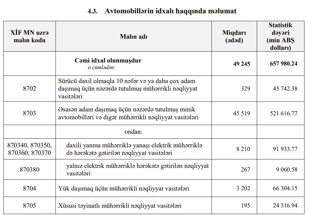 2022-ci ilin 8 ayı ərzində (yanvar-avqust) Azərbaycana 657 milyon 980 min dollar dəyərində 49 min 245 ədəd nəqliyyat vasitəsi idxal edilib.