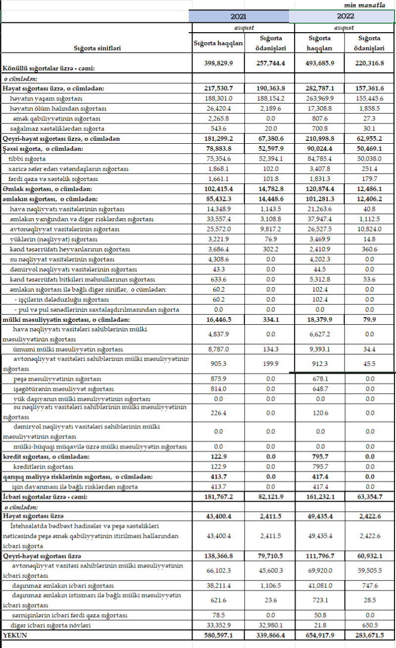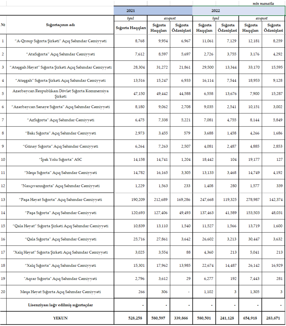 2022-ci ilin avqust ayı üzrə hesablanmış sığorta haqları və sığorta ödənişləri açıqlanıb.