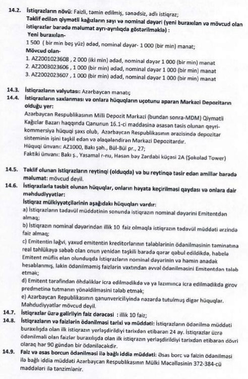 Marja.az Emissiya Prospektinə istinadən xəbər verir ki, emissiya hər birinin nominal dəyəri 1000 manat olan 1500 ədəd istiqrazdan ibarətdir.