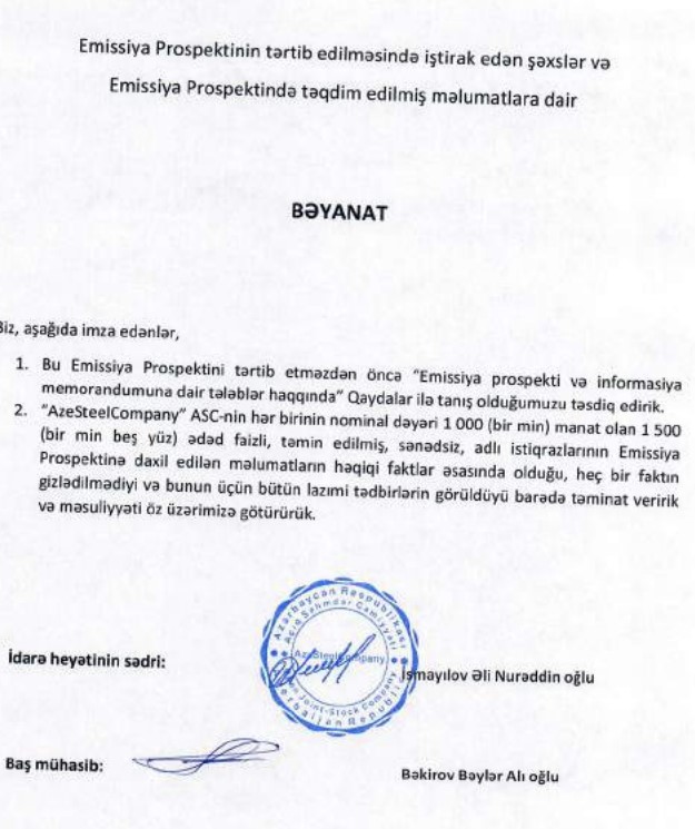 Metal məmulatlarının istehsalı ilə məşğul olan "AzeSteel Company" ASC şirkət 1,5 milyon manatlıq istiqraz buraxır.
