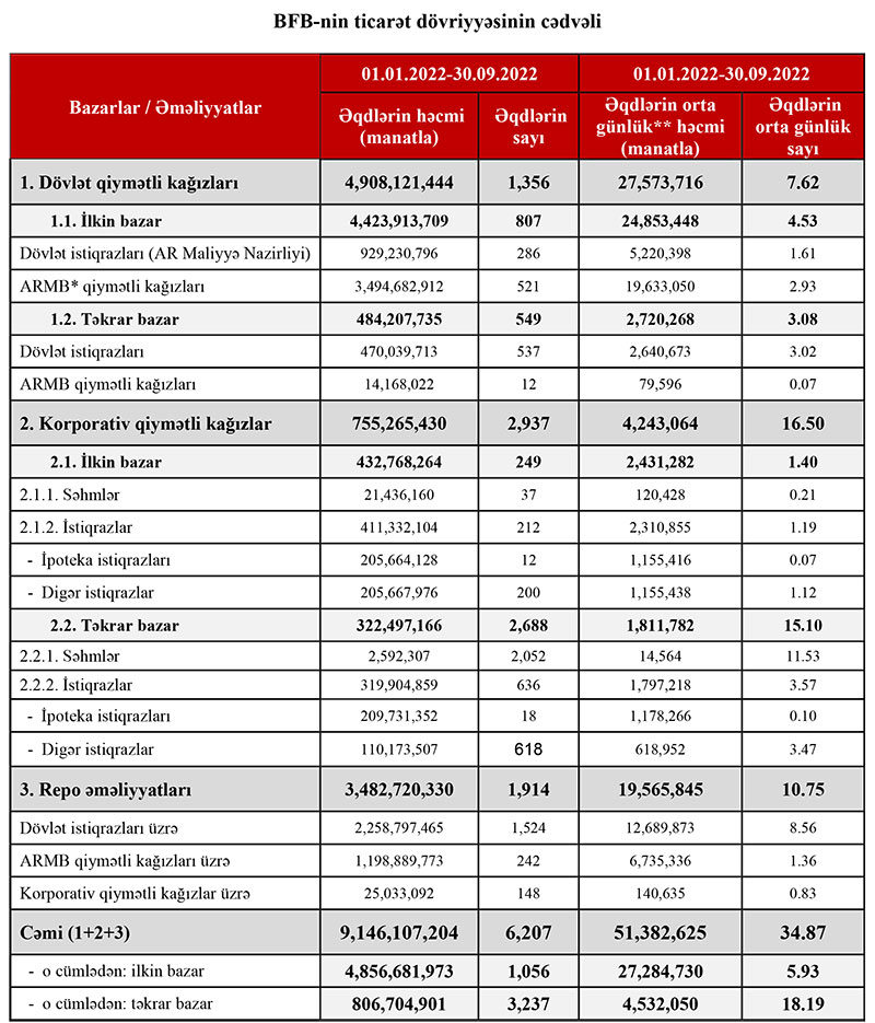 Bakı Fond Birjasında 01.01.2022-30.09.2022 tarixləri ərzində qiymətli kağızlar üzrə keçirilən əməliyyatların ümumi həcmi 9 milyard 146 milyon 107 min manat təşkil edib. Xatırladaq ki, ötən ilin eyni dövründə BFB-də qiymətli kağızlar üzrə keçirilən əməliyyatların ümumi həcmi 11 milyard 947 milyon 606 min manat təşkil etmişdi.