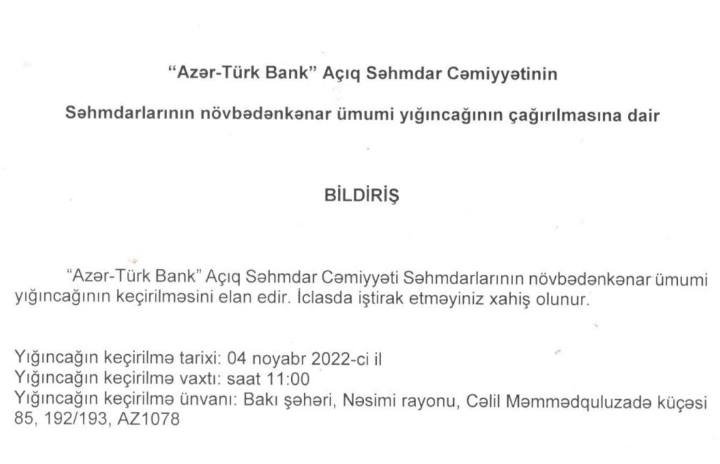 04 Noyabr 2022-ci il tarixində "Azər-Türk Bank" ASC səhmdarlarının növbədənkənar ümumi yığıncağı keçiriləcək.