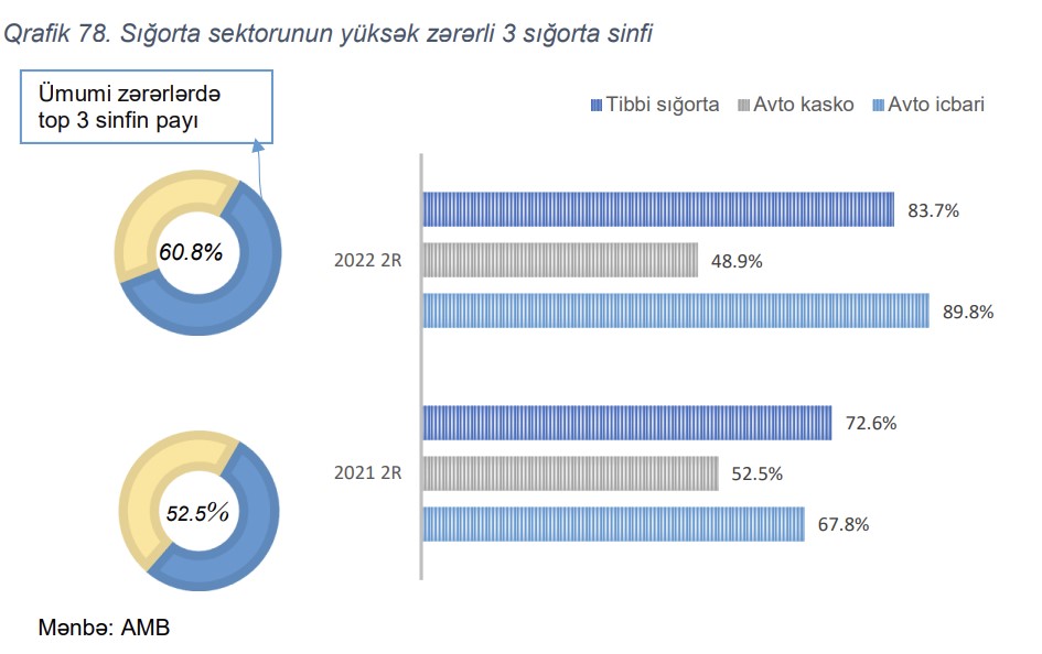 Qeyd edilib ki, artım əsasən avtonəqliyyat vasitəsi sahiblərinin mülki məsuliyyətinin icbari sığortası sinfi üzrə müşahidə olunmuşdur. Artım ötən ilin müvafiq dövrü ilə müqayisədə 22 faiz bəndi təşkil etmişdir. Avtonəqliyyat vasitələrinin könüllü sığortası üzrə bu göstərici 3.6 faiz bəndi azalsa da, könüllü tibbi sığorta üzrə 11.1 faiz bəndi artmışdır. Bütövlükdə, ən zərərli 3 sinfin ümumi zərərlərdə payı 8.3 faiz bəndi artaraq 60.8%-ə çatmışdır.