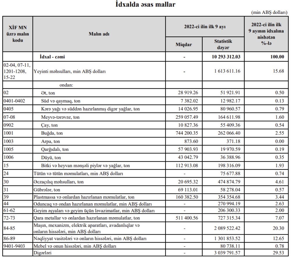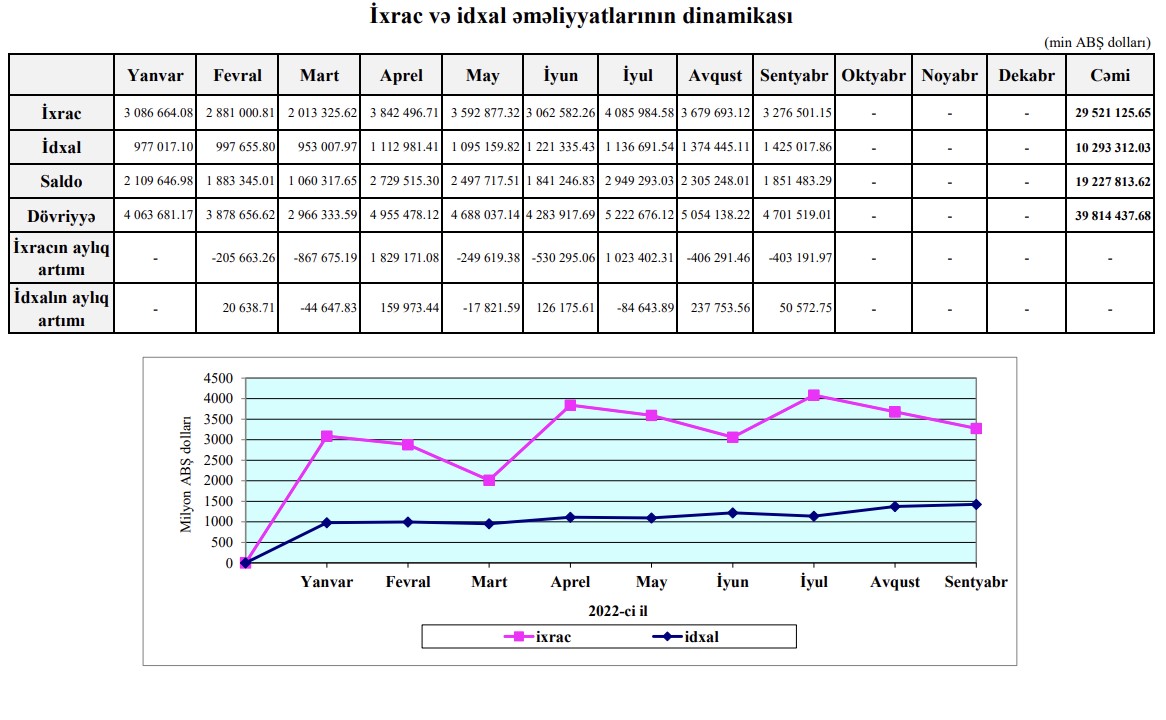 2022-ci ilin 9 ayı ərzində (yanvar-sentyabr) Azərbaycanın xarici ticarət əməliyyatlarının həcmi 39 milyard 814 milyon 437 min ABŞ dolları təşkil edib.