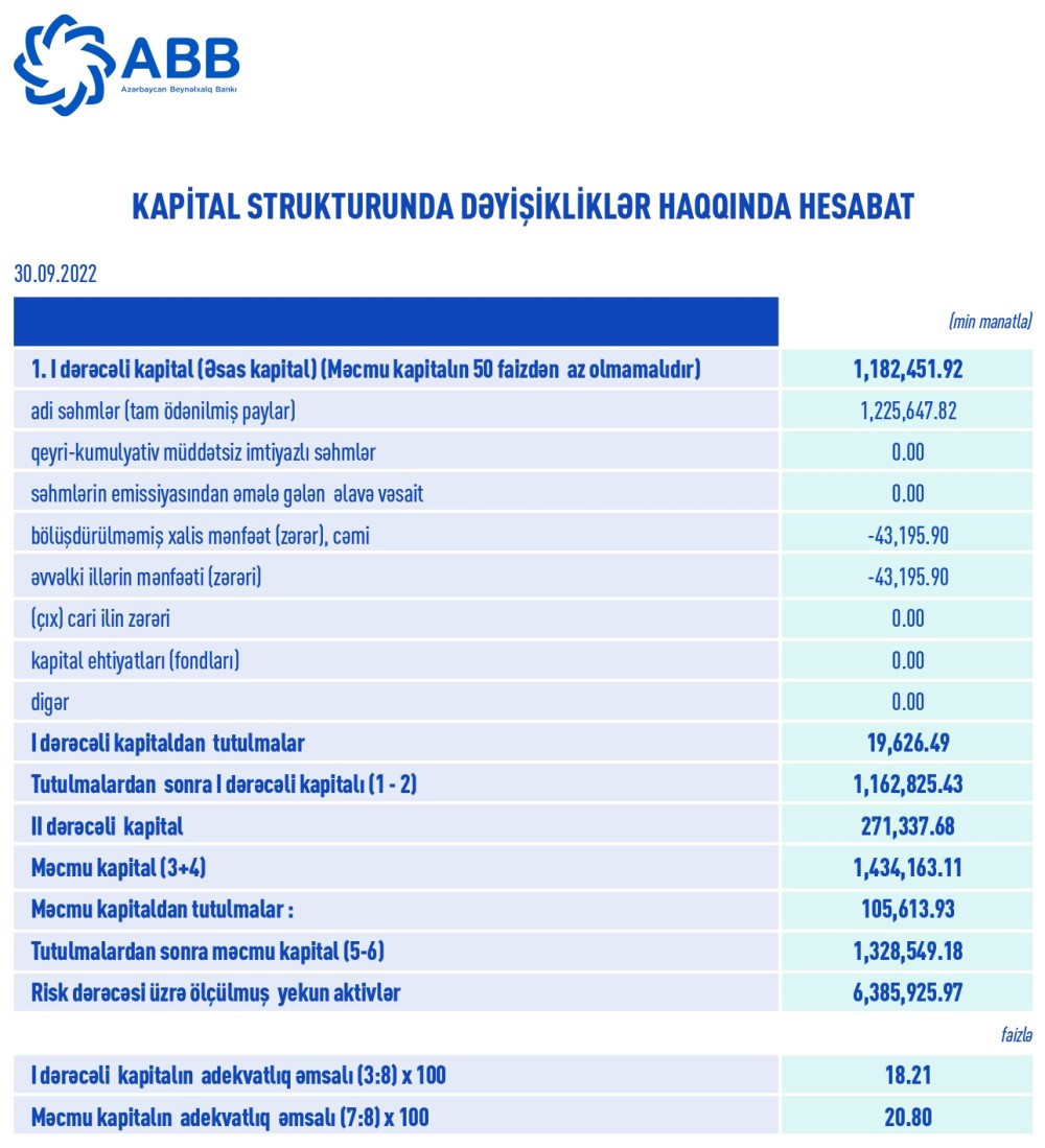 30 sentyabr 2022-ci il tarixində ABB 1 milyard 328 milyon 549 min manat məcmu kapitala malik olub. Bankın əmsalları sistem əhəmiyyətli banklar üçün normaları kəskin üstələyir. Belə ki, 1-ci dərəcəli kapitalın adekvatlıq əmsalı üzrə fakt 18,21% (norma 6%), məcmu kapitalın adekvatlıq əmsalı üzrə fakt 20,80% (norma12%), Leverec əmsalı üzrə fakt isə 8,85% (norma 5%) təşkil edib.