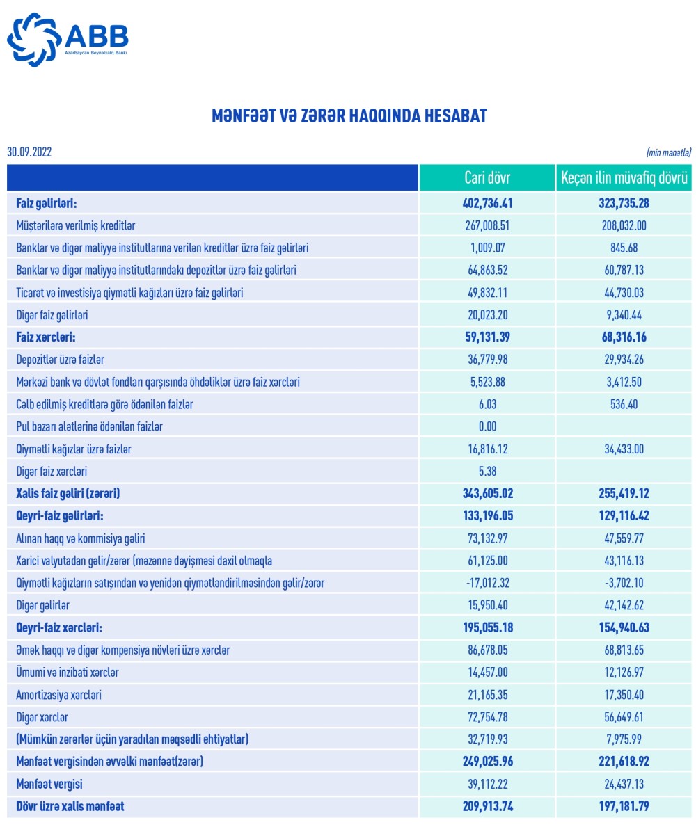 Əməliyyat gəlirləri əməliyyat xərclərini üstələdiyindən ABB cari ilin 9 ayını 281 milyon 746 min manat əməliyyat mənfəəti ilə bağlayıb (ötən ilin eyni dövründə 229 milyon 594 min manat). Bank əməliyyat mənfəətindən 32 milyon 720 min manat mümkün zərərlər üçün yaradılan məqsədli ehtiyatlara ayırıb və 39 milyon 112 min manat mənfəət vergisi ödəyib. Beləliklə, ABB 2022-ci ilin 9 ayını 209 milyon 914 min manat xalis mənfəətlə yekunlaşdırıb.