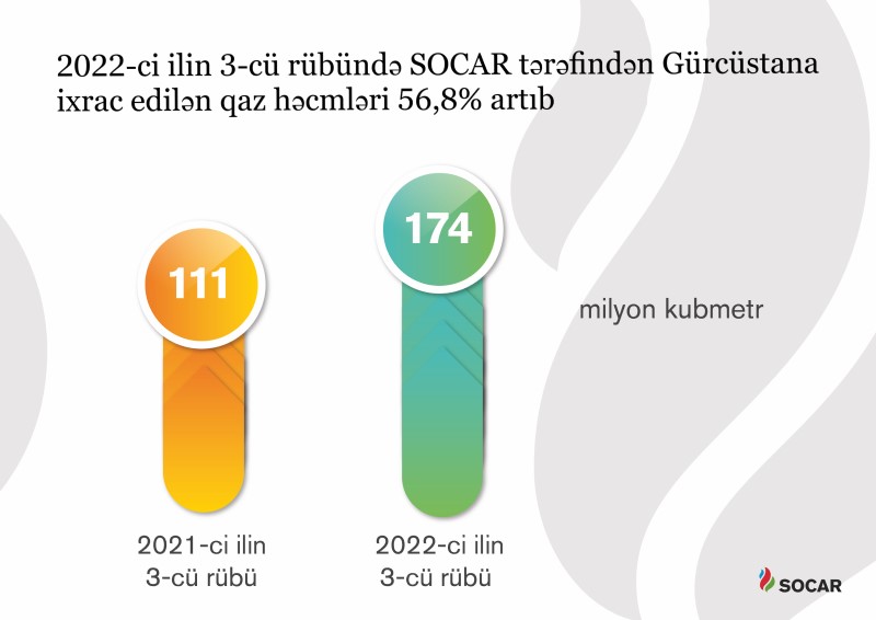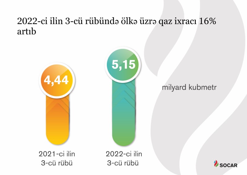 Ölkə üzrə ixrac olunan təbii qaz həcmləri 16% artaraq, 5,2 milyard kubmetr olub. SOCAR tərəfindən Gürcüstan bazarına isə 174 milyon kubmetr təbii qaz ixrac olunub. Qonşu ölkəyə ixrac edilən qaz həcmləri ötən ilin analoji dövrü ilə müqayisədə 56,8 faiz artıb.