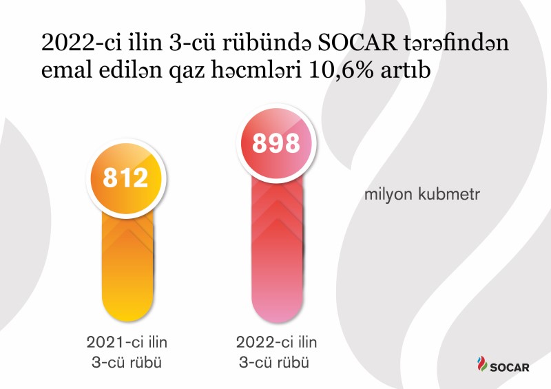 Cari ilin iyul-sentyabr ayları ərzində SOCAR tərəfindən 1,8 milyon ton neft, 898 milyon kubmetr qaz emal edilib. Qaz emalı ötən ilin analoji dövrü ilə müqayisədə 10,6% artıb.