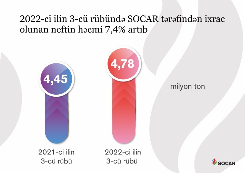 Cari ilin 3-cü rübündə SOCAR-ın ixrac göstəriciləri də qənaətbəxş olub. SOCAR tərəfindən ixrac edilən neftin həcmi 7,4% artaraq 4,8 milyon ton təşkil edib. SOCAR öz imkanları ilə hasil etdiyi neftdən əlavə beynəlxalq konsorsiumlar çərçivəsində SOCAR və Azərbaycanın payına düşən neft həcmlərini də ixrac edib.