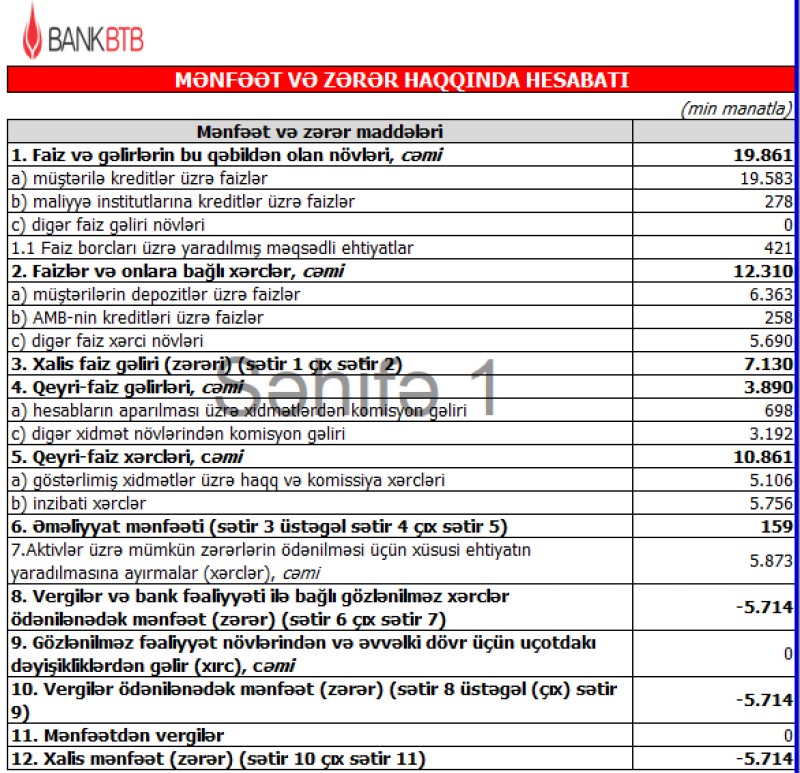 Müqayisə üçün qeyd edək ki, 2021-ci ilin yanvar-sentyabr dövründə "Bank BTB"nnin cəmi əməliyyat gəlirləri 22 milyon 395 min manat, cəmi əməliyyat xərcləri (faiz və qeyri-faiz xərcləri) 22 milyon 332 min manat, əməliyyat mənfəəti 63 min manat təşkil etmişdi. Ehtimal olunan zərərlər üçün yaradılan ehtiyatdan 1 milyon 111 min manatın qayıtması hesabına mənfəət 1 milyon 174 min manata yüksəlmişdi.
