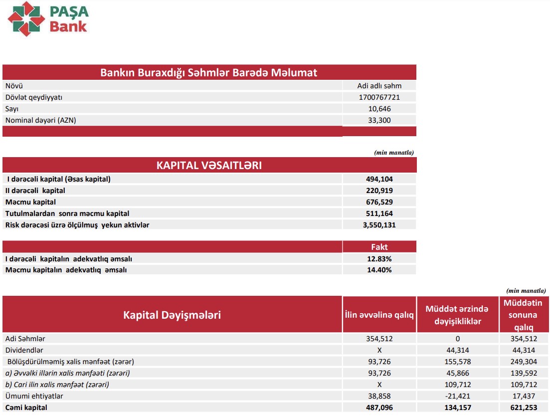 30 Sentyabr 2022-ci il tarixində "PAŞA Bank" 511 milyon 164 min manat məcmu kapitala malik olub.