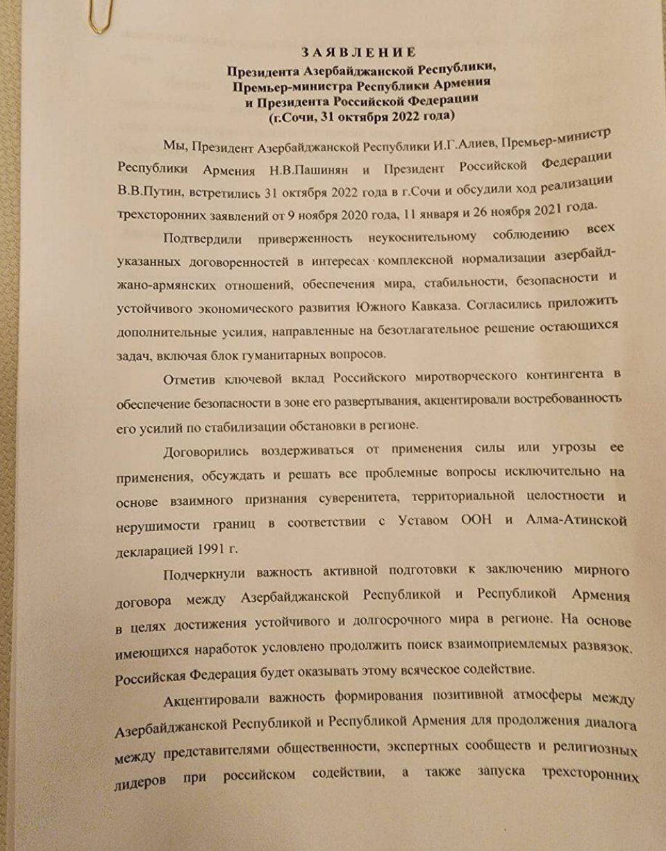 Biz, Azərbaycan Respublikasının Prezidenti İlham Əliyev, Ermənistan Respublikasının baş naziri Nikol Paşinyan və Rusiya Federasiyasının Prezidenti Vladimir Putin 2022-ci il oktyabrın 31-də Soçi şəhərində görüşdük və 2020-ci il 9 noyabr, 2021-ci il 11 yanvar və 26 noyabr tarixli üçtərəfli bəyanatların həyata keçirilməsinin gedişatını müzakirə etdik.
