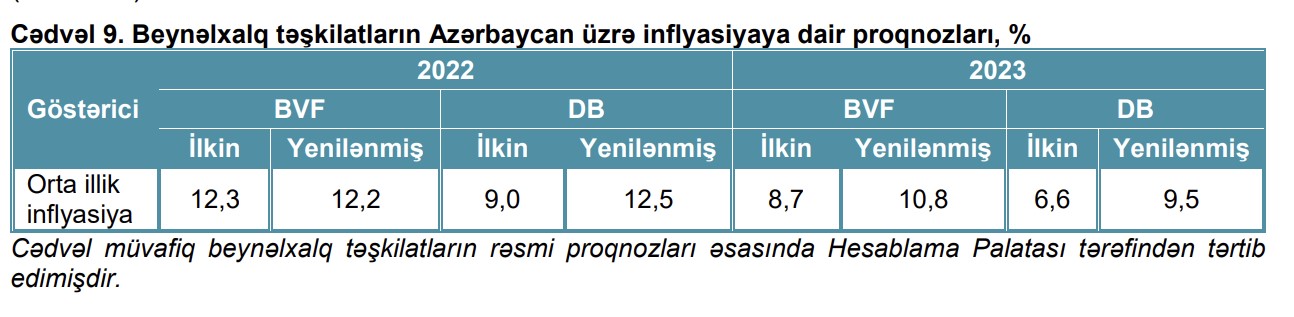 Rəydə qeyd edilib ki, hesabat ilində ikirəqəmli olacağı gözlənilən orta illik inflyasiyanın növbəti ildə nisbətən zəifləyərək təkrəqəmli olacağı proqnozlaşdırılmış, Hesablama Palatası tərəfindən aparılan hesablamalar həm cari il, həm də növbəti il üzrə inflyasiyanın proqnozlarının optimist yanaşma ilə hesablandığını deməyə imkan vermişdir.