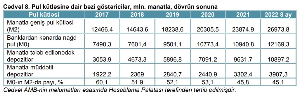 Məlumat üçün qeyd edək ki, 2022-ci il 01 sentyabr tarixinə manatla geniş pul kütləsi (M2) 26 milyard 973,8 milyon manat olmuş, bu məbləğin 45,1%-i banklardan kənarda nağd pul kütləsinin (M0) payına düşmüşdür . Əvvəlki illərlə müqayisədə, nağd pul kütləsinin manatla geniş pul kütləsində payı azalmış və 2017-ci ildəki 60%-dən 45%-dək enmişdir.