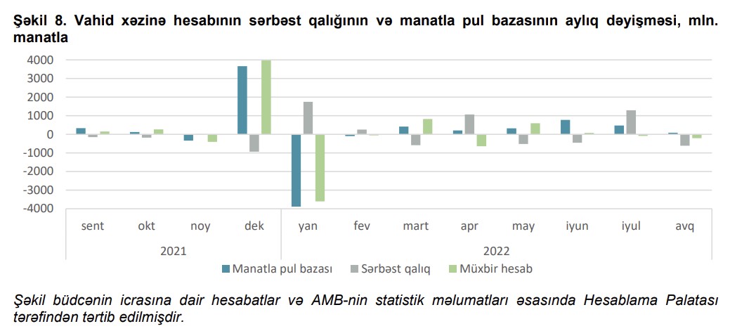 Rəydə qeyd edilib ki, ötən ilin sonuna nisbətən pul kütləsinin həcminin azalmasına həm də vahid xəzinə hesabının sərbəst qalığının artması azaldıcı təsir göstərmişdir. Belə ki, cari ilin yanvar-avqust aylarında vahid xəzinə hesabının sərbəst qalığı ötən ilin sonu ilə müqayisədə 2 milyard 177,1 milyon manat artaraq 3 milyard 446,1 milyon manata yüksəlmişdir. AMB-nin məlumatlarına əsasən, baxılan dövr ərzində manatla pul bazasının komponentlərindən olan dövriyyədə olan nağd pulların həcmi ilin əvvəli ilə müqayisədə 1 milyard 205 milyon manat artsa da, banklardakı müxbir hesablar 3 milyard 106 milyon manat azalmışdır ki, bu da xəzinə qalığının artması ilə izah edilə bilər.