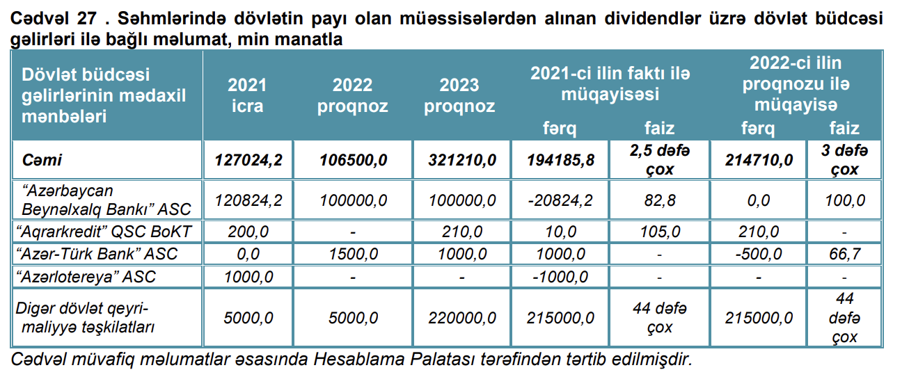 2023-cü ilin dövlət büdcəsi layihəsində dövlət qeyri-maliyyə təşkilatları üzrə dividend ödənişinin 200,0 mln. manatı Azərbaycan Respublikası Dövlət Neft Şirkəti (SOCAR), 15,0 mln. manatı "Azərbaycan Xəzər Dəniz Gəmiçiliyi" QSC, 5,0 mln. manatı isə "Azer Gold" QSC üzrə nəzərdə tutulmuşdur.