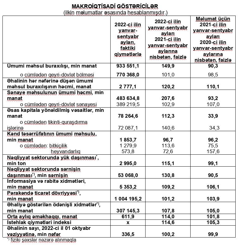 2022-ci ilin yanvar-sentyabr aylarında Gəncə şəhərinin iqtisadi və sosial inkişafının makroiqtisadi göstəriciləri açıqlanıb.