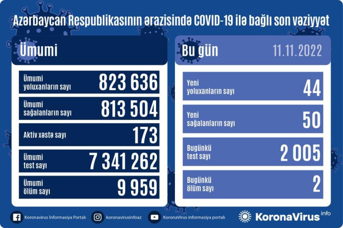Azərbaycanda koronavirus (COVID-19) infeksiyasına 44 yeni yoluxma faktı qeydə alınıb, 50 nəfər müalicə olunaraq sağalıb.