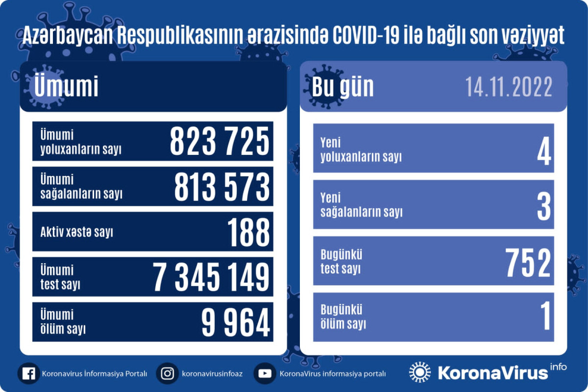 Azərbaycan Respublikasında koronavirus (COVID-19) infeksiyasına 4 yeni yoluxma faktı qeydə alınıb, 3 nəfər müalicə olunaraq sağalıb.