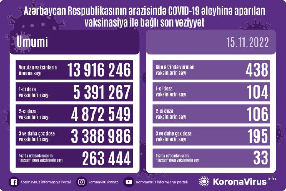 Azərbaycanda son sutkada koronavirus (COVID-19) əleyhinə 438 vaksin vurulub. Bir gündə birinci mərhələ üzrə vaksinasiya olunanların sayı 104, ikinci mərhələ üzrə vaksinasiya olunanların sayı 106, üç və daha çox doza üzrə vaksinasiya olunanların sayı 195, pozitiv nəticədən sonra buster doza üzrə vaksinasiya olunanların sayı 33 nəfərdir.
