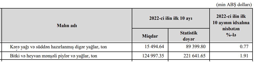 2022-ci ilin 10 ayında bitki və kərə yağları idxalına görə Azərbaycandan xaricə 311 milyon 42 min dollar valyuta çıxıb. Ötən ilin eyni dövründə bitki və kərə yağlarının idxalına 239 milyon 589 min dollar xərclənmişdi. Beləliklə, yağların idxalına görə çəkilən xərc 71 milyon 453 min dollar artıb. Bu artım bitki və kərə yağlarının pərakəndə satış qiymətlərində əks olunur və əhali tərəfindən ödənilir.