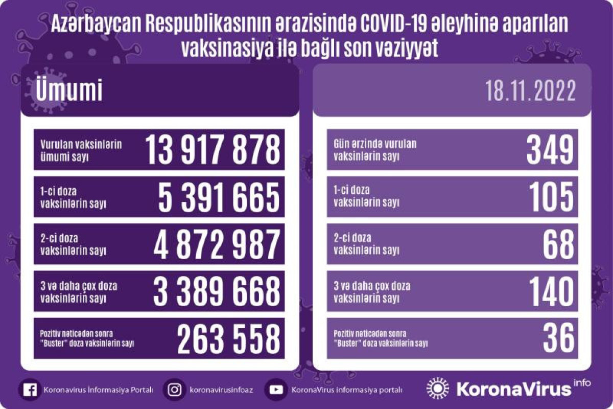 Vurulan vaksinlərin ümumi sayı 13 917 878, birinci mərhələ üzrə vaksinasiya olunanların ümumi sayı 5 391 665, ikinci mərhələ üzrə vaksinasiya olunanların sayı 4 872 987, üç və daha çox doza üzrə vaksinasiya olunanların sayı 3 389 668, pozitiv nəticədən sonra buster doza üzrə vaksinasiya olunanların sayı isə 263 558 nəfər təşkil edir.