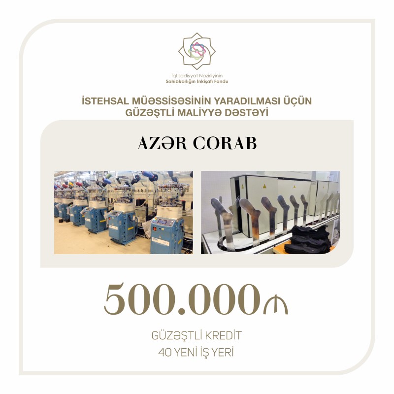 Yerli istehsala dəstək tədbirləri çərçivəsində "Azər Corab" MMC-yə corab istehsalı fabrikinin yaradılması üçün Sahibkarlığın İnkişafı Fondu tərəfindən 500 min manat güzəştli kredit ayrılıb.