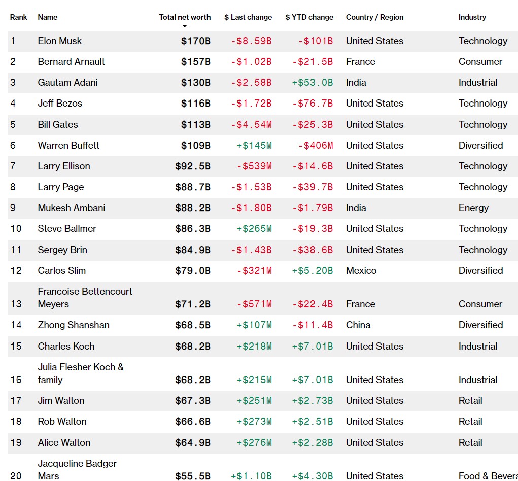 Təkcə bazar ertəsi Maskın sərvəti 8,6 milyard dollar azalıb. Maskın sərvəti 170 milyard dollara düşüb. Bununla belə, Mask Bloomberg Milyarderlər İndeksində birinci yerini qoruyur.
