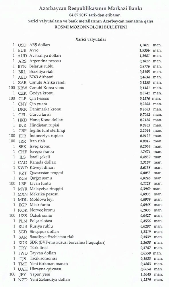 İyulun 4-nə Mərkəzi Bankın açıqladığı rəsmi Dollar/manat məzənnəsi İyulun 3-ü ilə müqayisədə dəyişməyərək 1,7021 manat olub, Avro/manat məzənnəsi 1.9356 manata düşüb.
