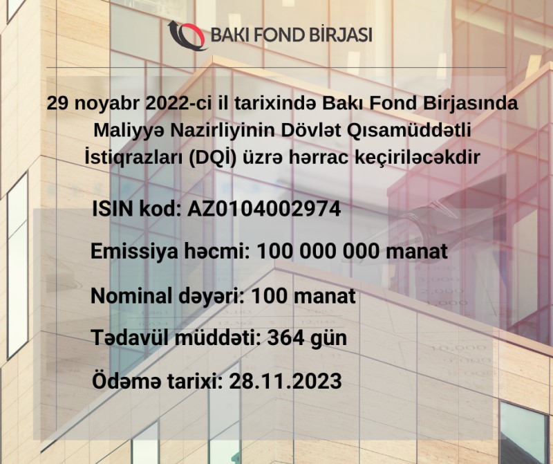 29 noyabr 2022-ci il tarixində Bakı Fond Birjasında Maliyyə Nazirliyinin 100 milyon manatlıq Dövlət Qısamüddətli İstiqrazları (DQİ) üzrə hərrac keçiriləcəkdir.