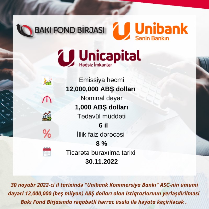 Birjanın yaydığı məlumata görə, 30 noyabr 2022-ci il tarixində "Unibank Kommersiya Bankı" ASC-nin istiqrazlarının yerləşdirilməsi Bakı Fond Birjasında rəqabətli hərrac üsulu ilə həyata keçiriləcəkdir.