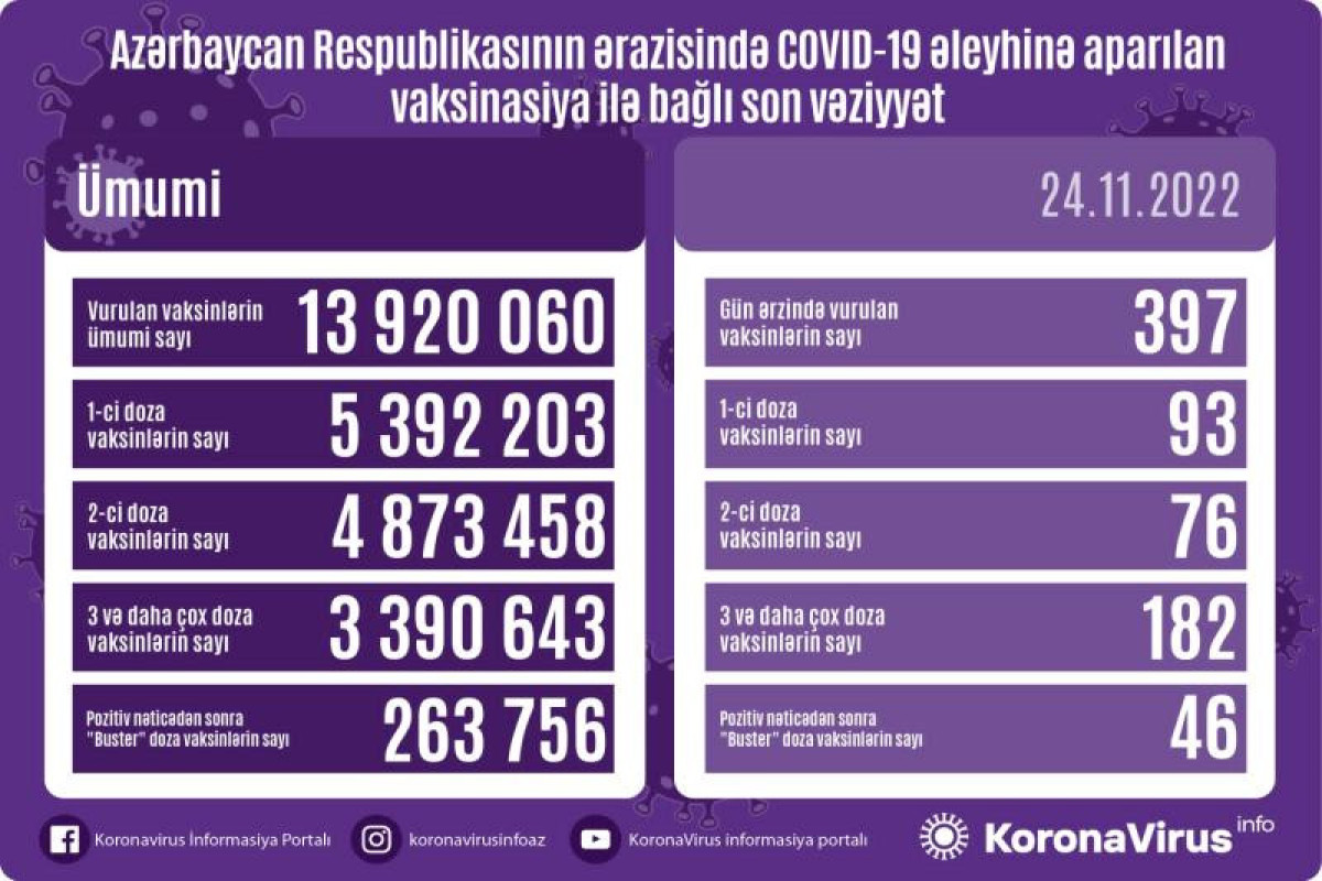 Azərbaycanda son sutkada koronavirus (COVID-19) əleyhinə 397 vaksin vurulub. Bir gündə birinci mərhələ üzrə vaksinasiya olunanların sayı 93, ikinci mərhələ üzrə vaksinasiya olunanların sayı 76, üç və daha çox doza üzrə vaksinasiya olunanların sayı 182, pozitiv nəticədən sonra buster doza üzrə vaksinasiya olunanların sayı 46 nəfərdir.